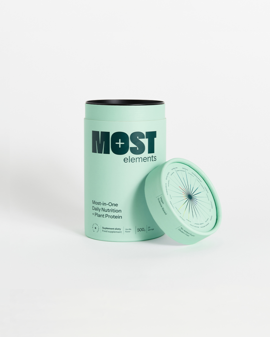 Most-In-One Daily Nutrition + Plant Protein to kompleksowy blend pełnowartościowych greens, superfoods, adaptogenów⁺, grzybów, witamin z grupy B, C i D oraz składników mineralnych i enzymów trawiennych, z dodatkiem 14 g białka roślinnego. W jednej porcji dostarczysz swojemu organizmowi większość składników odżywczych potrzebnych do całościowego wsparcia Twojego aktywnego trybu życia, regeneracji oraz wzrostu beztłuszczowej tkanki mięśniowej.
